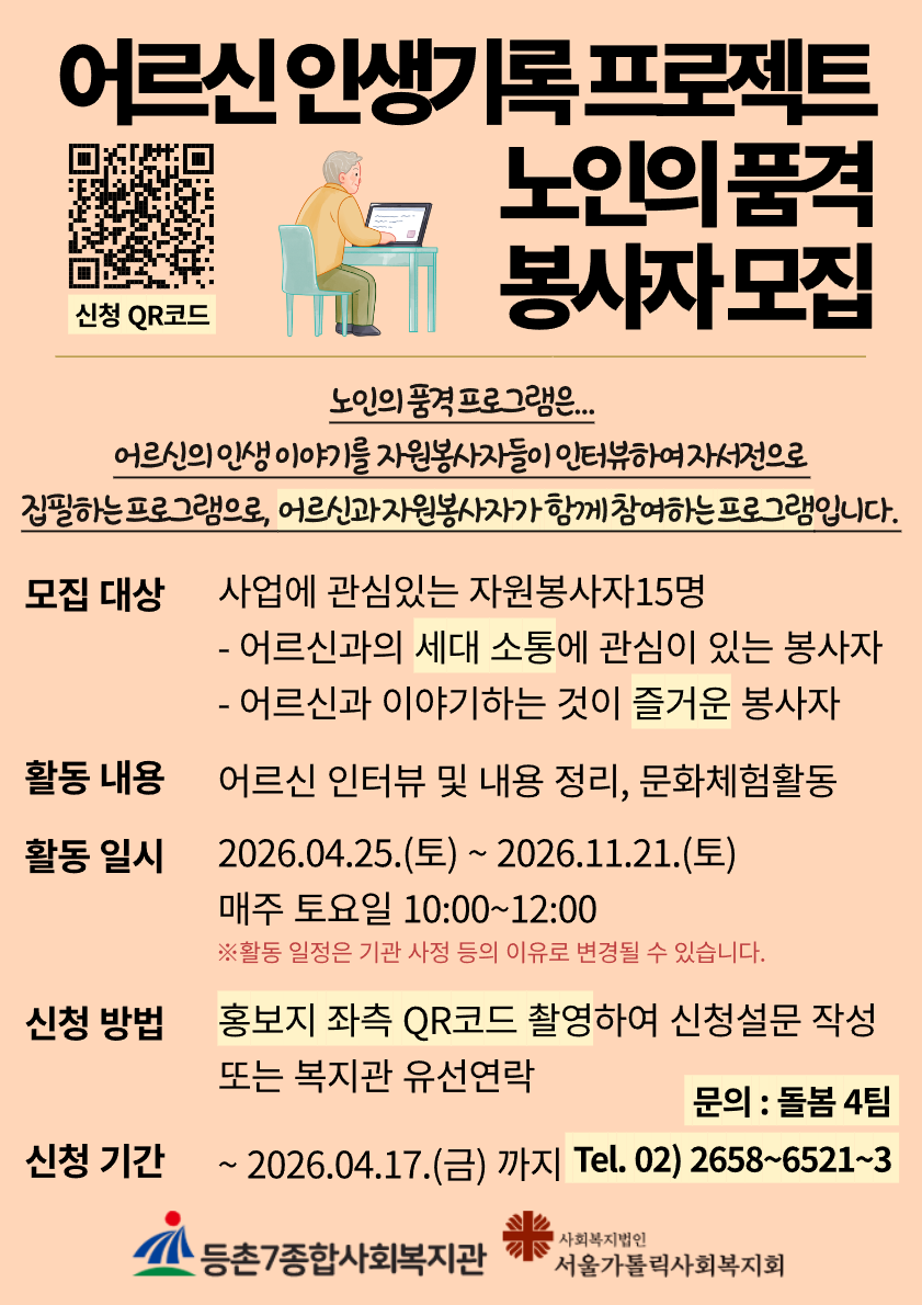 | 제목 | 2026년 등촌7종합사회복지관 어르신자서전쓰기사업 '노인의품격' 자원봉사자 모집 홍보 | ||||