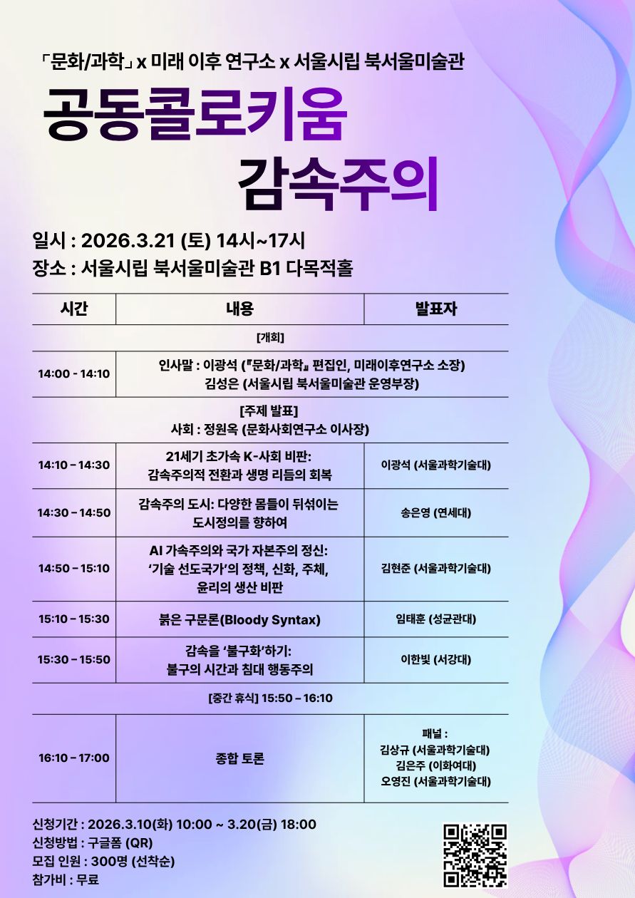 | 제목 | 미래 이후 연구소×『문학/과학』×서울시립 북서울미술관, 공동콜로키움 ‘감속주의’ 개최 | ||||